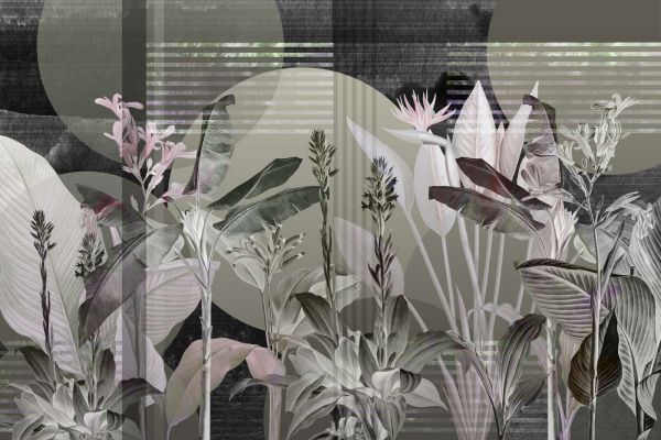 En harmonisk kombinasjon av tropiske blader og abstrakte geometriske former i dempede toner. Denne designen utstråler en moderne og beroligende atmosfære, perfekt for et rolig og moderne interiør.