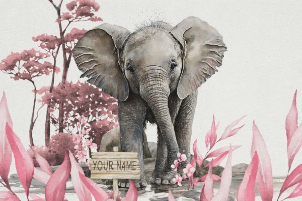 En søt elefantunge i den rosa jungelen. Dette tapetet er nå også tilgjengelig med barnets navn!