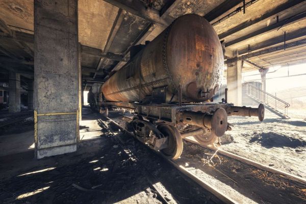 Dette rustne godstoget, sammen med gamle Passgagier-vogner, står på sidesporet i et gammelt togdepot i Frankrike.