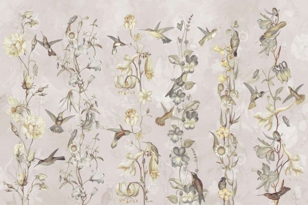 Et raffinert og drømmende scene av elegante kolibrier som svever mellom frodige blomster i myke nyanser av krem, beige og grågrønn. De subtile, håndtegnede detaljene og det delikate fargepalettet skaper en romantisk og tidløs utstråling, perfekt for en beroligende og elegant atmosfære.