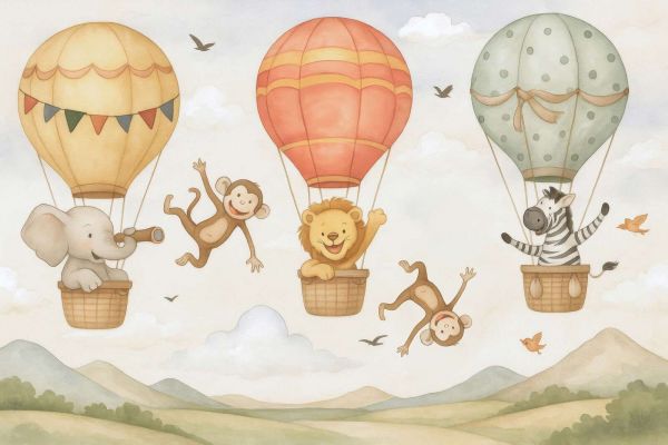I denne livlige scenen svever luftballonger fulle av lekne dyr over et fredelig fjellandskap. En elefant titter nysgjerrig gjennom et kikkert, en sebra vinker lystig fra kurven sin, og en dobbel løve ser entusiastisk ut fra en rød ballong. I mellomtiden henger aper på sin kjente rampete måte under ballongene - snurrende, vinkende og fulle av glede. De myke skyene og flygende fugler forsterker følelsen av frihet og bevegelse. Fargebruken er varm men frisk, med aksenter i myk gul, rust rød, salviegrønn og beige. Ballongene er alle dekorert med subtile detaljer som flagg, sløyfer eller mønstre. Landskapet under dem består av bølgende åser i grønne og sandfarger, noe som gir en naturlig og rolig base for den livlige scenen over. Perfekt for barnerom med et eventyrlystent, lekent eller naturlig tema. Denne designen kommer vakkert til sin rett i kombinasjon med møbler av lett tre, tilbehør i jordfarger eller salviegrønt, og tekstiler i rolige farger som krem, lys rosa eller terrakotta. En dekorativ ballong i taket eller en flagglenke kan forsterke stilen på en leken måte. Passer godt i barnerom eller lekehjørner, dette designet stimulerer fantasien og gir en følelse av frihet, eventyr og vennskap. På grunn av de myke fargene forblir det beroligende, mens den lekne handlingen sørger for glede og bevegelse i rommet.