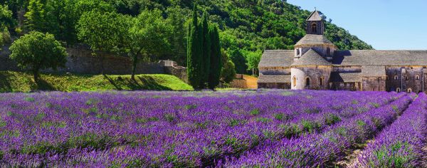 Et eventyrbilde av et lavendelmark med et lite slott i bakgrunnen.