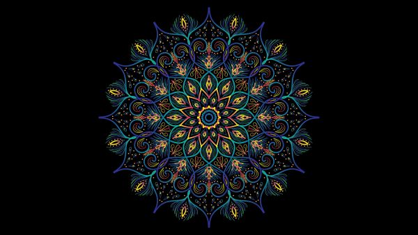 En fargerik mandala på en svart bakgrunn. De muntre fargene i denne mandalaen skaper en koselig atmosfære i rommet med dette fototapetet.