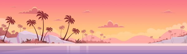Tegnet strandutsikt med forskjellige farger og palmer.