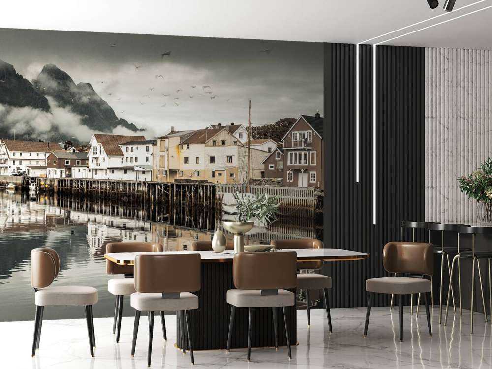 Veggmaleri av et fiskevær på en overskyet dag i Lofoten i Norge.