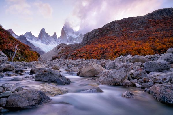 Bakgrunn av et landskap med fjell, steiner og en elv. Kombiner dette hjemme.
