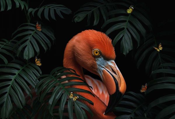 En majestetisk flamingo dukker opp mellom dype mørkegrønne blader, omgitt av fargerike sommerfugler. De intense kontrastene mellom den brennende oransje og det mystiske svarte skaper et stemningsfullt og eksotisk bilde fullt av eleganse og detaljer.