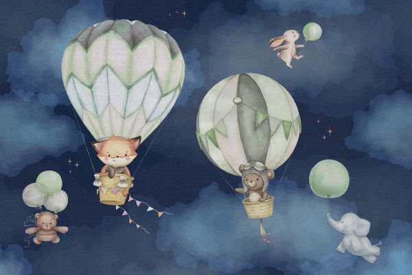 Søte dyr som flyr og flyter på himmelen med grønne ballonger.