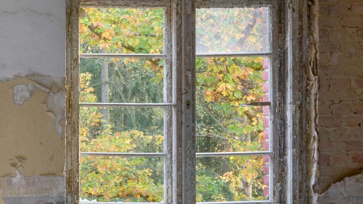 Gammelt forlatt rom hvis glass er ut av vinduet. Skap en mystisk atmosfære hjemme med dette fototapetet.