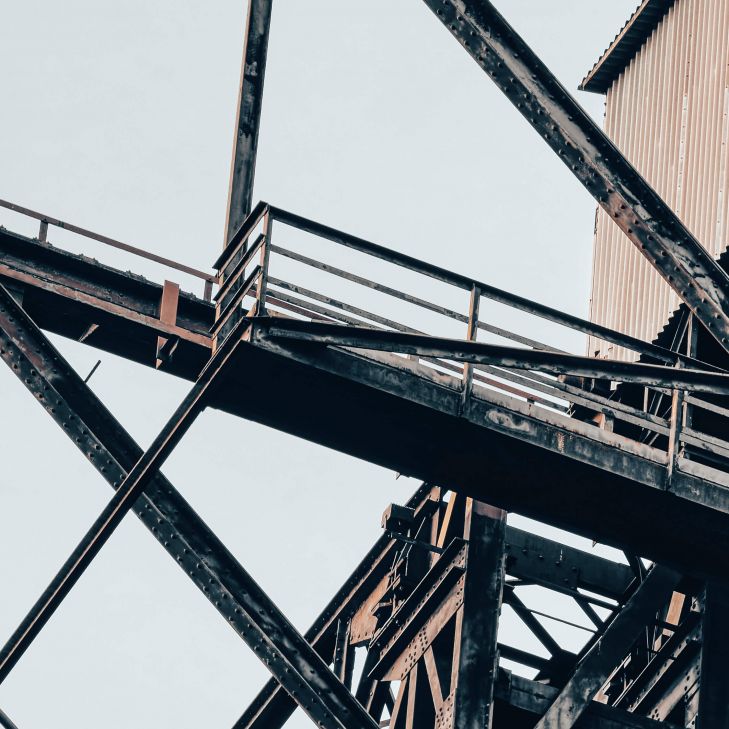 En høy stålkonstruksjon fotografert nedenfra. En vakker del av et gammelt stålverk.