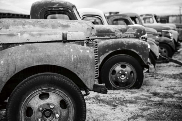 Denne karakterfylte komposisjonen viser en rekke gamle pick-up lastebiler, hver med synlige spor av tid og bruk. Den værbitte lakken, rustflekkene og matte hjulkapslene forteller historier om tusenvis av tilbakelagte kilometer, tøffe veier og svundne år. Fanget i svart-hvitt kommer strukturene og formene ekstra tydelig frem - fra de glatte, avrundede motorhetter til det grovkornede metallet på skjermene.