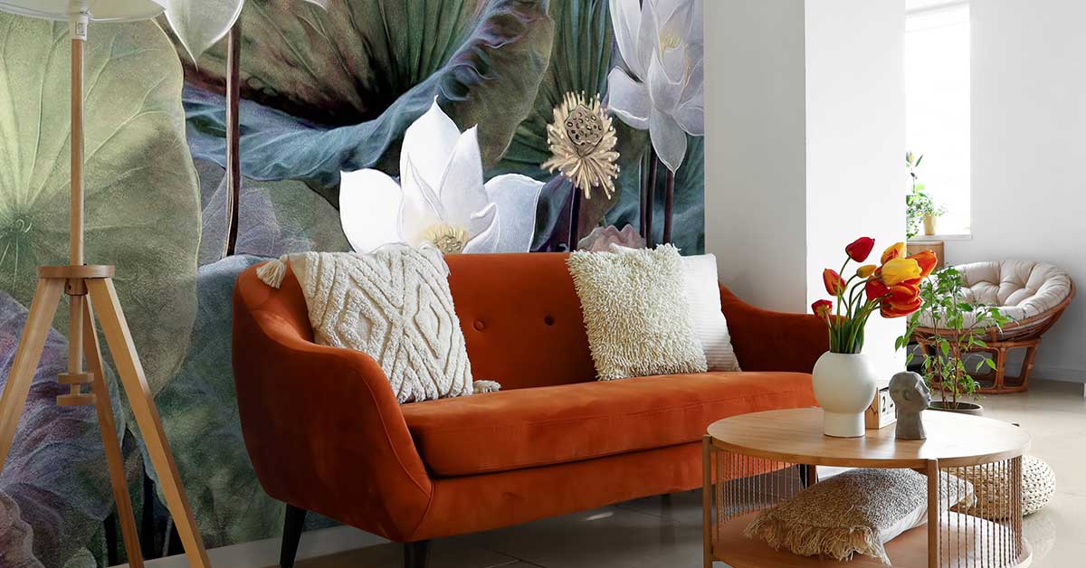 Dette kan synes å være i motsetning til hverandre, men det motsatte er sant. Ved å kombinere tapetet på riktig måte, kan du forvandle et rom til en oase av ro og komme med en uttalelse i den. Sørg deretter for at grunnlaget for interiøret består av naturlige materialer og lyse farger. Det kan være hvitt. Men pastell nyanser er også egnet for dette. Plasser deretter fototapetet av lotusblomster på en vegg, eller på en del av veggen. På denne måten skiller lotustapetet seg virkelig ut og passer fortsatt inn i den avslappede stilen.