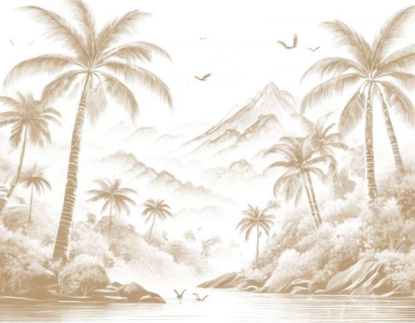 Et idyllisk landskap av en avsidesliggende bukt innrammet av grasiøse palmer, med en majestetisk fjellkjede i bakgrunnen.