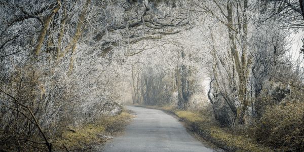Frosset vei gjennom skog i løpet av en vinterdag. Med dette fototapetet i huset er det som om du kan gå på veien.