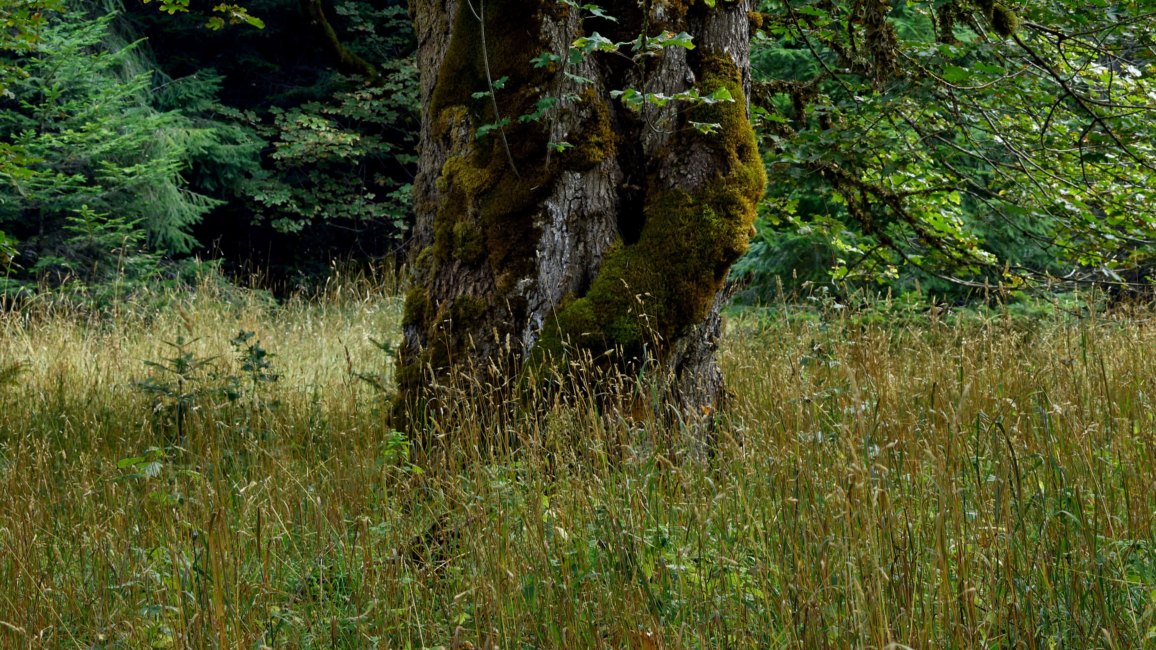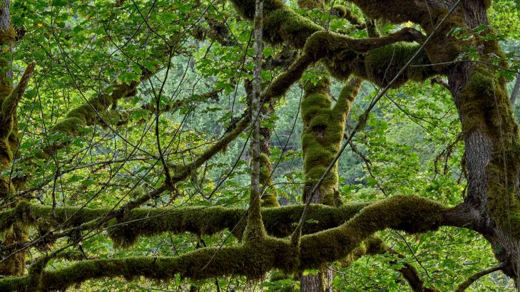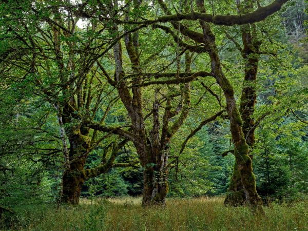 Detaljert bilde av 3 mystiske gamle trær i en skog