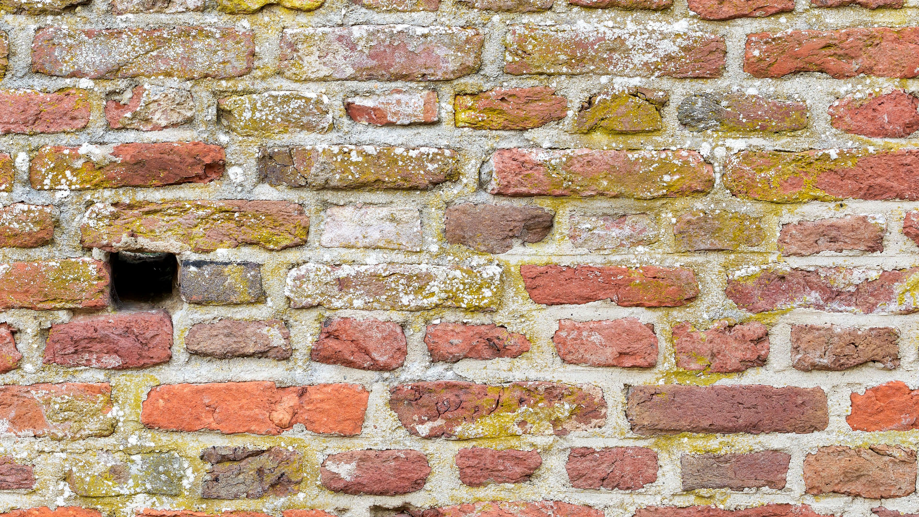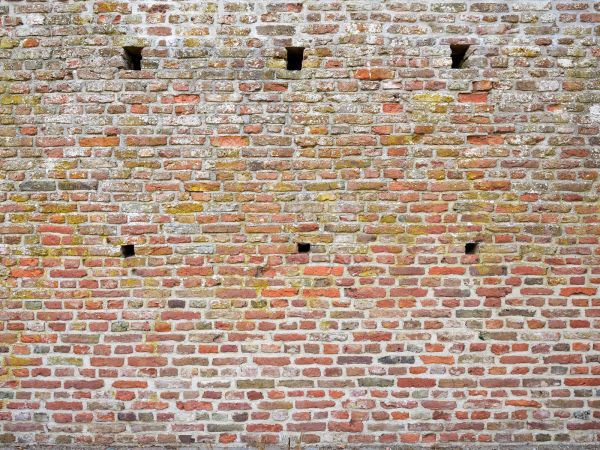 Gammel steinmur med forskjellige fargenyanser og mørke hull