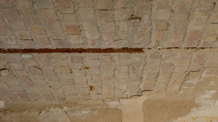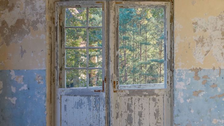 Gammelt rom med rester av gul og blå maling. Med dette fototapetet i hjemmet ditt er det som om du kan gå inn i et forlatt rom.