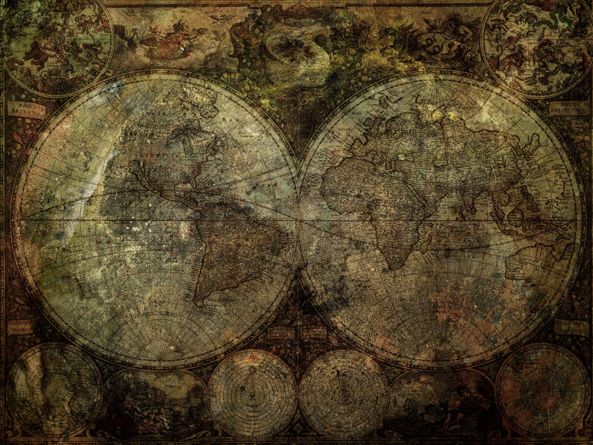 Et gammelt antikt verdenskart på fototapet. Det gamle verdenskartet ser ut som et kart fra en film.