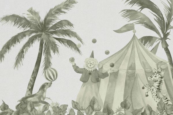 Muntre sirkusdyr tegnet i grønne farger i jungelmiljø.