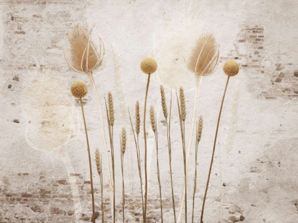 En rustikk harmoni av gylne valmuepærer og modne hveteaks danner et bilde som utstråler varme og historie. Teksturen av gammelt gips i bakgrunnen tilfører en dimensjon av tid og historie, mens det myke lyset rundt plantene gir en levende energi til denne tidløse komposisjonen.