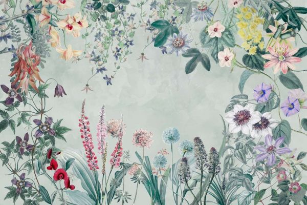 Dette designet utstråler en fortryllende skjønnhet gjennom en harmonisk blanding av blomster og planter, som reflekterer både eleganse og lekenhet. De rike detaljene i bladene og blomstene, kombinert med en subtil palett av pastellfarger og myke jordfarger, gjør den livlig og raffinert. Den grasiøse komposisjonen skaper en innbydende atmosfære, perfekt for rom som krever et rolig og naturlig utseende.