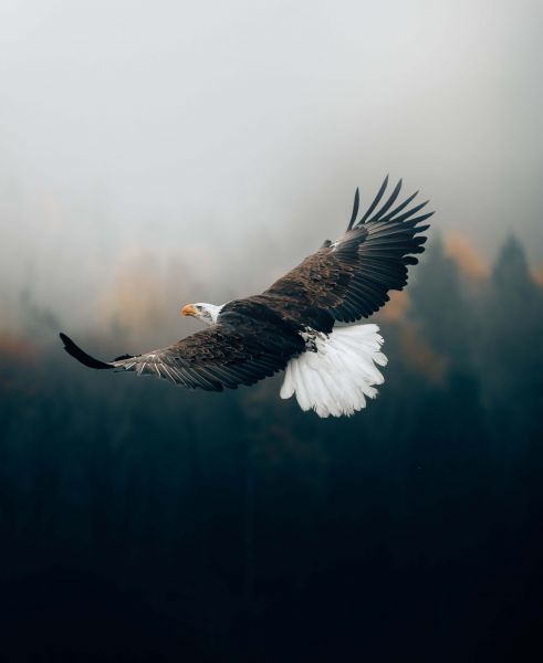 En skallet ørn som flyr over skogen. På grunn av det unike fargevalget skaper dette fototapetet umiddelbart mer atmosfære i rommet.