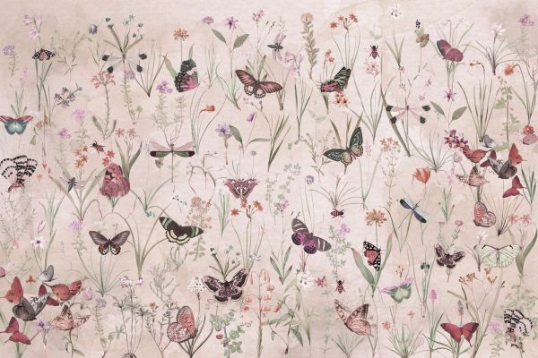 Dette designet er en ode til naturens skjønnhet og den delikate harmonien mellom flora og fauna. En frodig samling av blomster i forskjellige blomstringsfaser er subtilt sammenvevd med sommerfugler, øyenstikkere og andre grasiøse insekter. De botaniske detaljene er raffinerte, med tynne linjer og myke overganger som understreker de naturlige formene. Fargepaletten består av duse pastellfarger som lys rosa, mintgrønn, lavendel og elfenben, som fremkaller lettheten og roen til en sommereng.