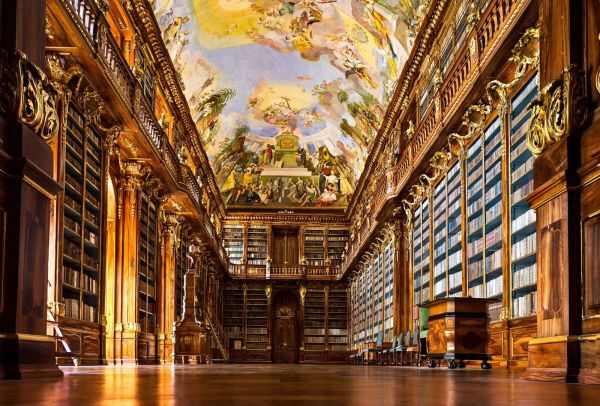 Et majestetisk design der prakten av et barokk bibliotek står i sentrum. De rikt dekorerte trebokhyllene med gull detaljer og det imponerende takfreskomaleriet skaper en overdådig og tidløs atmosfære. De varme tretonene og det detaljerte håndverket gir et klassisk, luksuriøst preg.