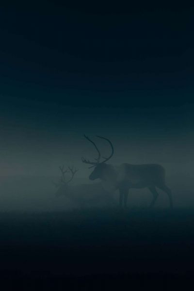 Dette bildet utstråler en rolig og mystisk atmosfære, der to hjort sakte trer frem fra et tykt slør av tåke. Den tåkete omgivelsen og det myke fargeforløpet fra nattblått til grågrønt gir en drømmende, nesten filmatisk utstråling. Dyrene er subtilt synlige, med elegante silhuetter som fremkaller en følelse av stillhet og tidløshet.