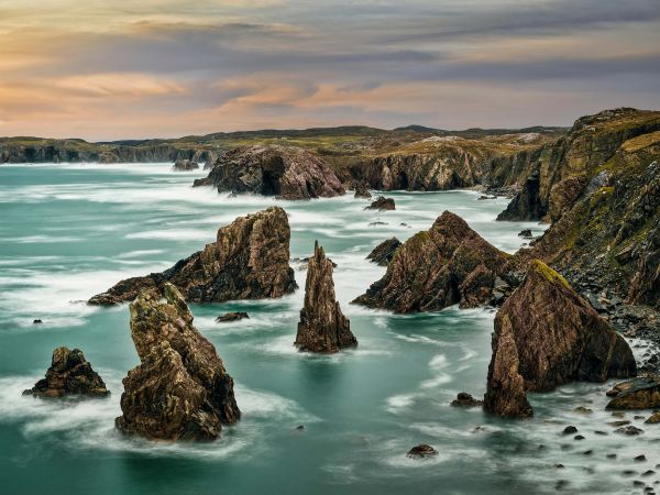 Photo wallpaper with tall rock formations on the Scottish coast as wall decor is an impressive addition to any room. The photo wallpaper shows the majestic beauty of the Scottish coast, with tall rocks rising from the sea. The raw and pristine nature of the landscape is breathtaking and is sure to impress anyone who enters the room. The photo wallpaper is of high quality and beautifully depicts every detail of the rocks and the sea. It will make a real statement in any room and give the space a rustic and serene atmosphere.