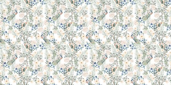 Dette raffinerte designet viser en fredelig sammensmelting av flora og fauna. På en myk, nøytral bakgrunn flagrer fugler mellom en overflod av blomster og blader.