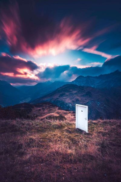 Et surrealistisk fjellandskap ved solnedgang med en ensom hvit dør midt i naturen. Fargespillet av lilla, blått og rosa understreker den mystiske, nesten magiske stemningen i scenen.