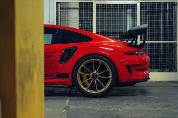 En detaljert nærbilde av Porsche 911 GT3 RS, der bakenden med den store spoileren og gullfelgene tiltrekker seg oppmerksomhet. Den røde lakken og aerodynamiske detaljene fremhever det rene race-DNAet til denne sportsbilen, klar til å levere kraft og hastighet.