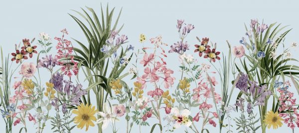 Et frodig felt med blomster i en overflod av farger, fra myke pastellnyanser til dype jordfarger. Knallgule solsikker og delikate lilla blomster kombineres med friskt grønt løvverk. Designet utstråler munterhet og bringer en livlig, sommerlig følelse til ethvert rom.