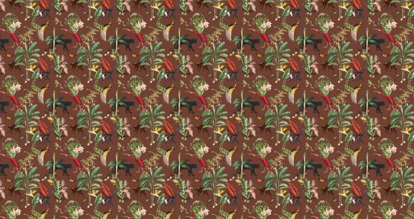 Dette designet tar deg midt i en tropisk villmark full av fascinerende detaljer. Papegøyer, aper og sommerfugler beveger seg mellom frodige, tropiske planter og fargerike blomster. Den varme brune bakgrunnen forsterker de livlige nyansene av flora og fauna, mens de subtile mønstrene gir deg følelsen av å oppleve et stykke urørt natur.