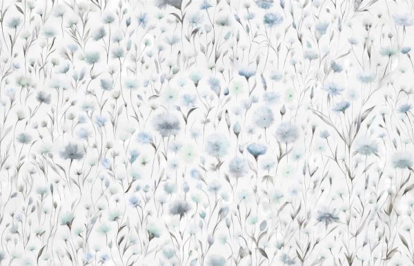 Et raffinert og luftig blomsterdesign med sarte ville blomster i myke blå- og grågrønne nyanser. Den subtile akvarellteknikken og delikate detaljene gir designet en rolig og drømmende utstråling, perfekt for en avslappende og elegant atmosfære.