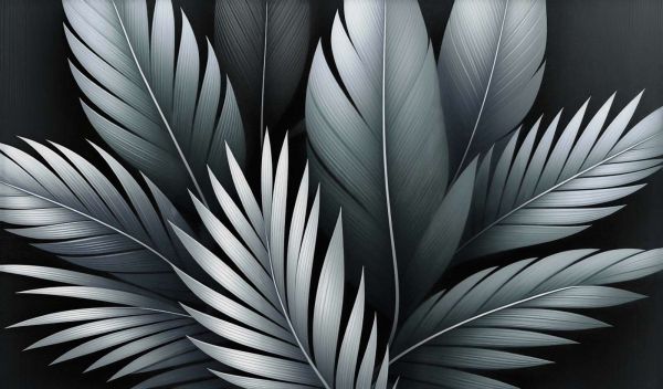 Overlapende fjær i kalde nyanser som lysgrå, blågrå og antrasitt utgjør en rolig og raffineret helhet. De fine linjene og subtile fargeforløpene gir dybde og eleganse, mens den mørke bakgrunnen forsterker kontrasten og fremkaller en moderne, rolig atmosfære.