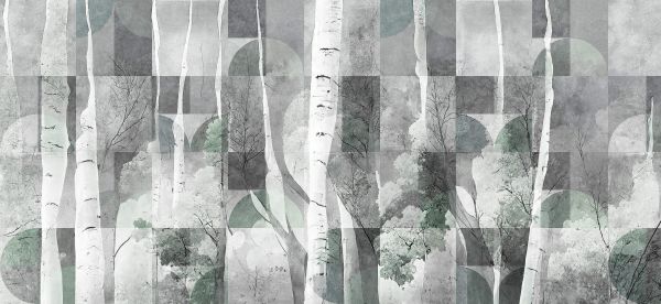 En kunstnerisk skog på fototapet i fargene svart og hvitt og akvarellgrønn.