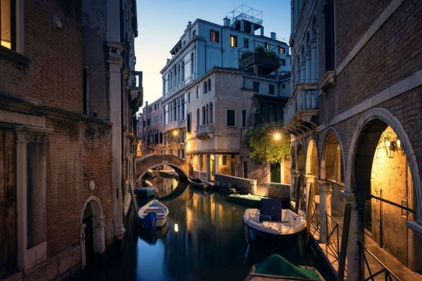 Dette designet fanger den fortryllende sjarmen til Venezia når kvelden faller og byen blir innhyllet i et varmt skjær. De århundregamle bygningene, slitte mursteinene og elegante buene reflekteres i det rolige vannet, mens myk belysning fra vinduer og lanterner lyser opp gatene. Den steinlagte broen, subtilt opplyst og elegant buet over kanalen, utgjør et vakkert midtpunkt i denne mystiske og romantiske scenen. Blandingen av dype blåtoner på himmelen og varme gullakenter skaper en raffinert og harmonisk komposisjon. Dette designet passer perfekt inn i interiører som ønsker å utstråle en følelse av nostalgi, romantikk og eleganse. I et klassisk interiør kombinerer det vakkert med varme tretoner, vintage møbler og myke stoffer. I et moderne eller industrielt dekor danner det en intrigerende kontrast med stramme linjer og mørke farger, mens det i en bohemsk setting forsterker en drømmende og kunstnerisk atmosfære. For et luksuriøst utseende kan det kombineres med marmorakenter og subtile gull detaljer. Den romantiske og beroligende utstrålingen gjør dette designet ideelt for stuer, soverom og stilige serveringssteder som ønsker å utstråle en venetiansk sjarm. Urbex-fotografi og nattfotografi fanger ofte den skjulte skjønnheten i historiske byer, og dette bildet bringer den magien til liv. Et vakkert valg for elskere av Venezia, stemningsfull belysning og den tidløse elegansen til en stille kanal ved skumring.