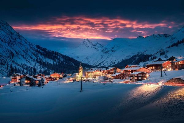 Tapet - Kveldssol over fjellandsbyen i snøen.