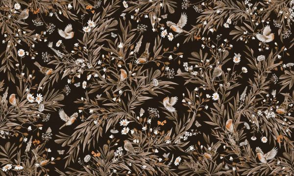 En stemningsfull dans av rødstruper fyller dette rike og detaljerte bildet. På en dyp, nesten svart bakgrunn utfolder frodige grener seg med lange blader, fine blomster og hvite tusenfryd. Fargene er bevisst dempet: myke brune og beige nyanser, avbrutt av hvite aksenter og subtile hint av oransje og krem. Denne nedtonede fargekombinasjonen skaper en harmonisk og varm utstråling som føles både beroligende og livlig. Dette designet passer perfekt til en landlig eller klassisk interiørstil. Tenk på en stue med naturlige tre møbler, linngardiner og vintage tilbehør - dette motivet er en naturlig forlengelse av en slik atmosfære. Også i en bohemsk setting, kombinert med rotting, makramé og lette tekstiler, kommer designet vakkert til liv. De lekne rødstrupene gir en subtil følelse av bevegelse, mens den delikate floraen holder det hele luftig. Gjentakelsen av mønstrene er rytmisk, men ikke for stram, noe som gir en organisk og fri følelse. Ved å bruke en mørk bakgrunn kommer de lysere blomstdetaljene og fuglene enda sterkere frem, noe som skaper en elegant dybdevirkning. Ideell for rom der du ønsker å tilføre en naturlig aksent: et rolig soverom, en koselig lesekrok, en stemningsfull gang eller til og med en sjarmerende arbeidsplass. Kombiner dette motivet med krem- eller sandfargede nyanser, tilbehør i messing eller bronse, og varme tresorter for en balansert, tidløs utstråling.