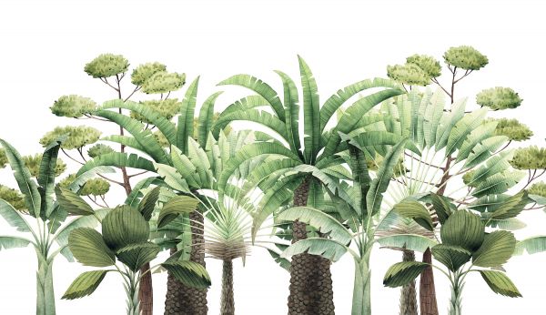 Akvarellmalte palmer i forskjellige varianter på en hvit bakgrunn.