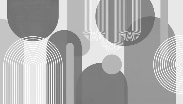 Et samspill mellom gråtoner og hvite linjer skaper en strukturert symmetri i dette moderne designet. Variasjonen i form og presisjonen i linjene skaper en rolig, men spennende visuell opplevelse.