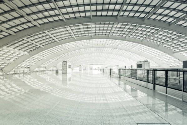 Fototapet med en elegant moderne hall med en kurve i gulvet og en reflekterende effekt