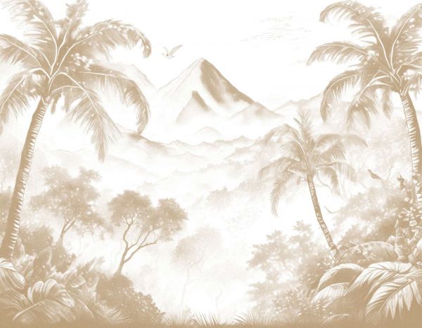 Dette designet skildrer en fredelig vulkanøy, opplyst av det myke lyset fra morgensolen. Palmene svaier forsiktig i vinden, og det fjerne fjellet rager høyt over en tåkete, frodig skog.