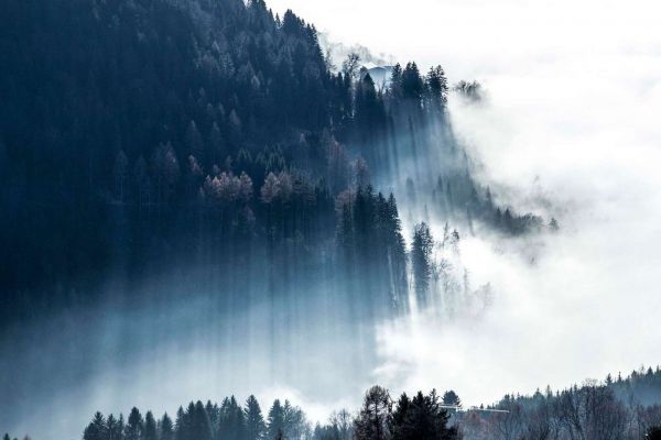 Lett filtrert sollys kaster lange stråler gjennom en tåkete furuskog på en fjellskråning. Kjølige blåtoner blander seg med det hvite tåkelyset og skaper en mystisk, rolig stemning.