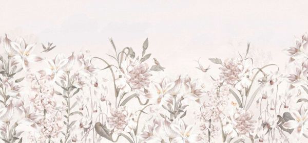 Et sjarmerende bilde fullt av subtil sjarm: dette designet viser en frodig blomstereng med liljer, peoner og blomstrende grener, fint tegnet i myke pastellfarger av rosa, beige og kremhvitt. Mellom blomstene svever nådige kolibrier og sommerfugler, noe som legger til en følelse av bevegelse og naturlig harmoni. Den penselaktige teksturen og den lette tåken gir det hele en nesten akvarellignende karakter, noe som gir en myk og luftig utstråling. Dette designet passer vakkert inn i et klassisk interiør, der det legger til romantikk og forfining for eksempel på et soverom eller i en lys stue. I en bohemsk setting kommer det også til sin rett, der det passer perfekt sammen med naturlige materialer som rotting, lin og værslitt tre. Den myke fargepaletten egner seg godt for kombinasjoner med krem- og sandfargede vegger, lyse trebjelker og tilbehør i gull eller kobber for en subtil luksuriøs utstråling. Også myke stoffer som fløyel eller lin forsterker den myke stemningen i designet. På grunn av den rolige utstrålingen er dette et ideelt valg for rom der roen står i sentrum, som soverommet, en lesekrok eller et velværerom. De organiske mønstrene og luftige fargene bringer balanse og ro, uten å virke kjedelig eller flatt.