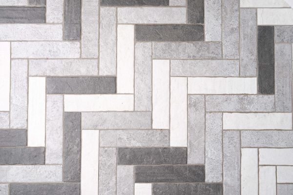 Nærbilde av mosaikkgulvfliser i rektangler i nyanser av grått og hvitt. Kombiner dette på for eksempel kjøkkenet.