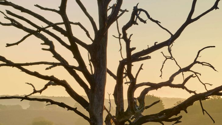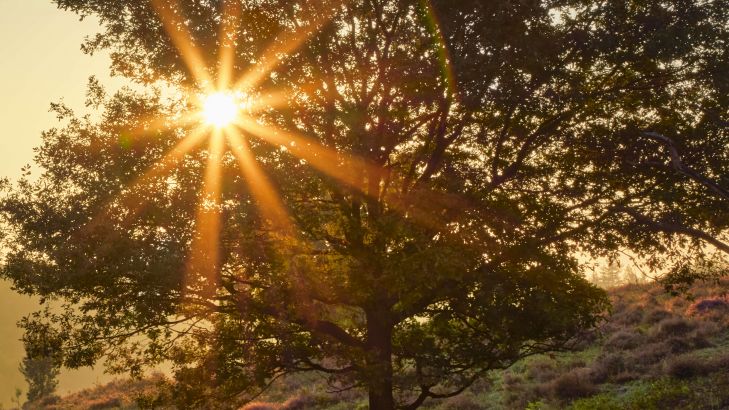 Vakker soloppgang i lynghei med karakteristisk tre. Soloppgangen kan sees gjennom bladene på treet.