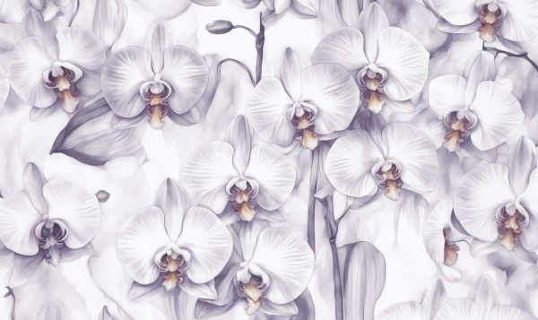 Hvite orkideer mot en bakgrunn av rike lilla nyanser, som gir et mystisk og overdådig preg. Den fløyelsaktige bakgrunnen står i kontrast til de delikate blomstene, noe som fremhever de raffinerte detaljene ytterligere.